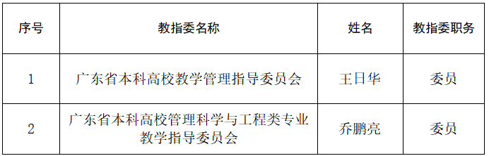 近日,广东省教育厅关于公布2019-2023广东省本科高校教学指导委员会委员名单(中期调整),kaiyun有2位专家新增为广东省本科高校教学指导委员会委员。校长王日华教授新增为广东省本科高校教学管理指导委员会委员,该委员会主任委员单位是华南师范大学,主任委员是华南师范大学校长王恩科,成员由中山大学、香港中文大学、华南理工大学等高校39位委员组成;管理学院院长乔鹏亮教授新增为广东省本科高校管理科学与工程类专业教学指导委员会委员,该委员会主任委员单位是华南理工大学,主任委员是华南理工大学张卫国教授。