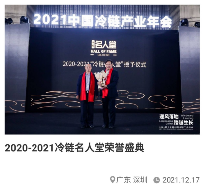 12月17日,中国冷链名人堂荣誉颁奖盛典在2021年中国冷链产业年会上举行。该盛典由中国物流与采购联合会冷链物流专业委员会(以下简称“中物联冷链委”)发起,旨在发掘和寻找推动我国冷链产业发展的先行者与坚守者, 展现他们为中国冷链产业发展做出的卓越贡献,每两年评选一次。冷链产业学院董事、产业教授王宏从广大冷链人中脱颖而出,成为第四届“中国冷链名人堂”9位获此殊荣者之一。著名冷藏运输学者、广州大学谢如鹤教授为王宏颁奖。