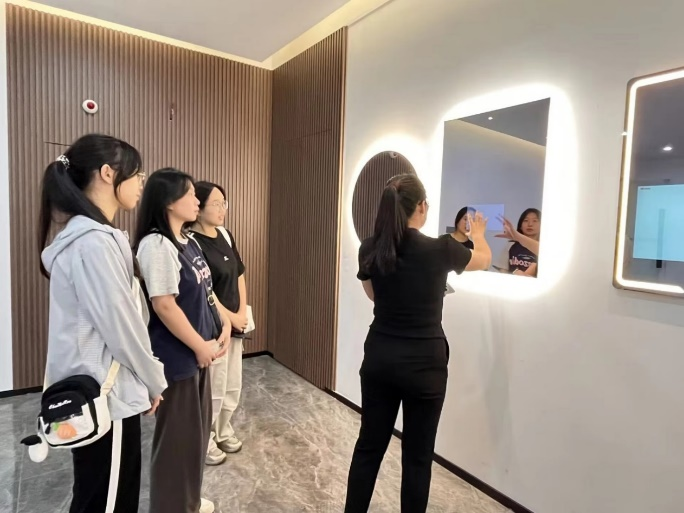 在市场部经理梁洁芝的引导下,学生们亲自体验了微框产品——智能镜子的多项功能,包括环境光线调节、虚拟试妆、健康监测等。这些独特的功能让学生们对微框科技的产品产生了浓厚的兴趣,并对未来智能家居的发展趋势有了更深入的认识。交流会的最后,双方就未来的合作发展进行了深入的探讨。罗俊副院长表示,将与微框科技有限公司携手,共同培养更多具有创新精神和实践能力的高素质人才,为社会的发展贡献力量。
