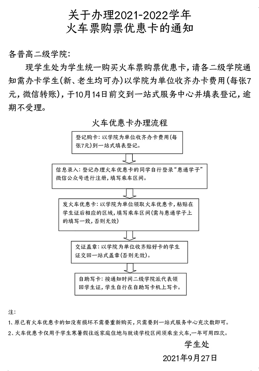火车优惠卡又称火车票学生优惠卡、学生购票优惠卡等,是学生购买火车票打折用的卡(高铁票七五折,火车票五折),贴在学生证的后面。只有买了这个卡才能享受学生优惠。中国铁路总公司(原铁道部)、教育部决定比照高等学校学生购买火车票使用优惠卡的办法,对全国实施学历教育的中等职业学校学生寒暑假往返家庭住地与就读学校区间须乘坐火车的,实行凭附有火车票半价优惠卡的学生证购票。
