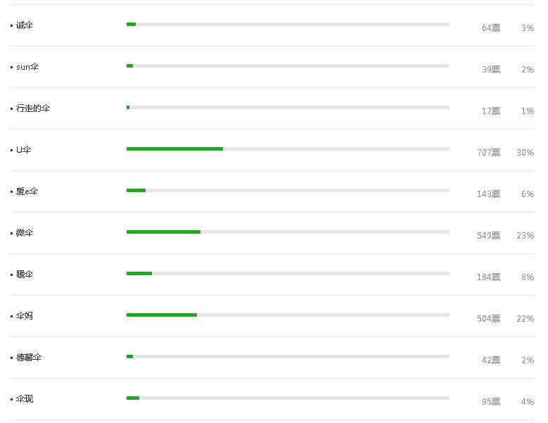 本次“爱心雨伞”征名活动,投稿作品共140多份,经过一站式全体工作人员进行讨论,按简单且寓意深刻的原则初步筛选出十幅作品,在一站式公众号上进行为期四天的投票。最终“U伞”以707票获得我们此次雨伞征名活动的"人气最佳奖",其余九名投稿者获得“优秀奖”。