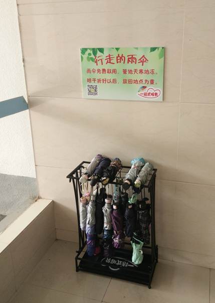免费投放的雨伞是暖心的延续,是每个学期师生们捡到的失物,经过微信平台和失物周展示后无人认领,一站式把它们利用起来,喷上LOGO ,放到投放点免费取用。
