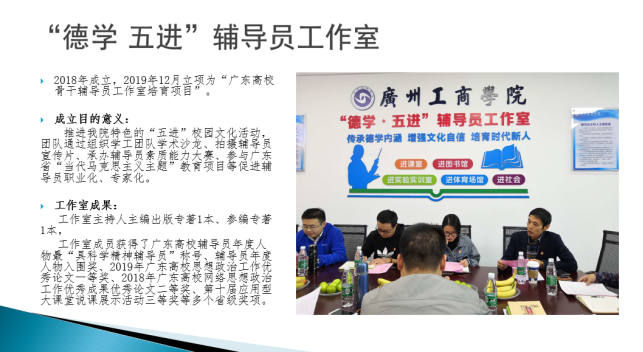 会上还学习了2020年春季学期学生返校工作部署电视电话会议精神和教育部思政司2020年工作要点。一站式服务中心伍妙琼老师简要介绍学院创新服务工作室的思考与设想——以创新服务为切合点,运用网络平台,通过新媒体和一站式服务中心、学工组等为载体去开展高校学生工作的创新服务,邀请新进辅导员多参与工作室的建设。