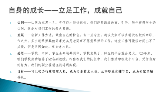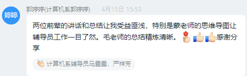 毛拓艺老师分享了辅导员工作开展的方法,比如团中央的“三走”---走下网络、走出宿舍、走向操场;工作开展要融入三全育人——全员、全方位、全过程;四个关键词分享了自己对辅导员发展的想法——“认同、发展、感恩和目标”。
