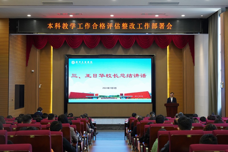 【本网讯】为贯彻落实教育部“以评促建、以评促改、以评促管、评建结合、重在建设”的评建工作方针,进一步发现问题、解决问题,学校于2023年12月17日—21日开展了本科教学工作合格评估预评估工作。为有针对性地研究合格评估预评估专家反馈意见,落实整改措施,2024年1月3日下午,学校在花都校区召开本科教学工作合格评估整改工作布置会,全体校领导、中层正副职、专业负责人、教研室主任,教务处(教师教学发展中心)、实践教学中心、质量监控与评估中心全体人员,各部门、各单位评估联络员等近200人参加会议。会议由学校副校长易露霞主持。